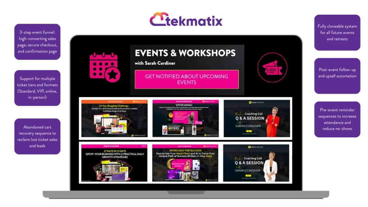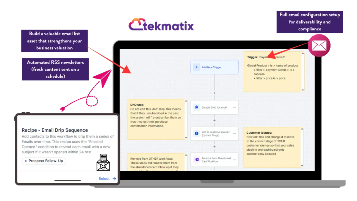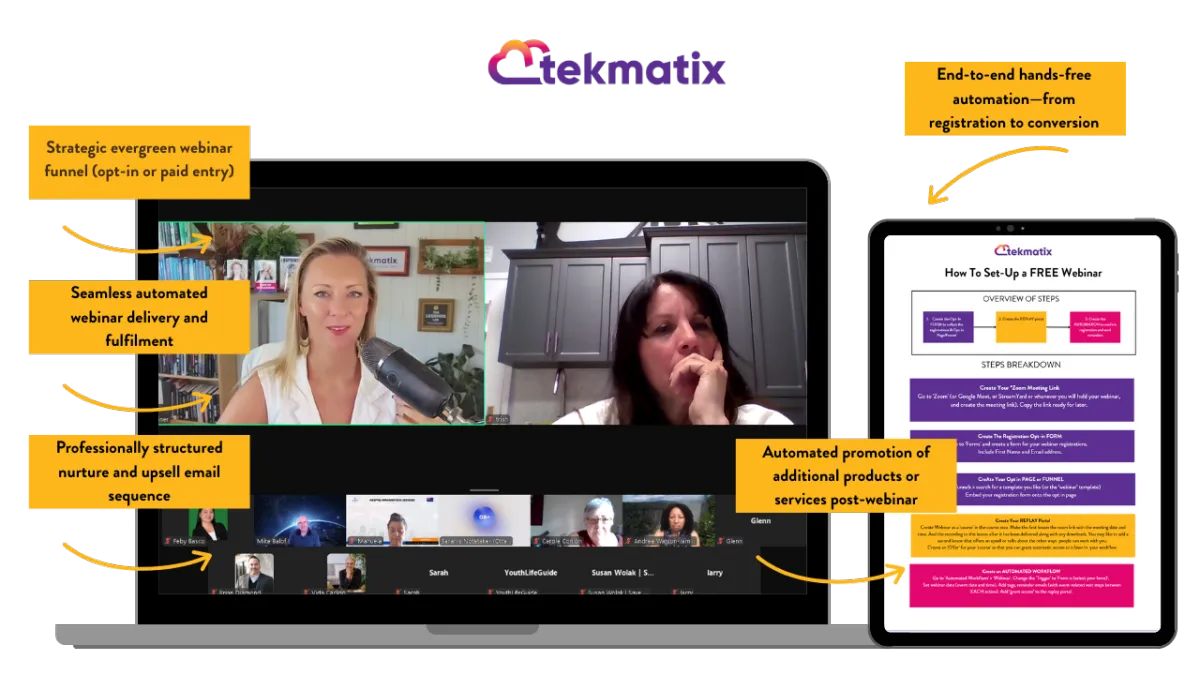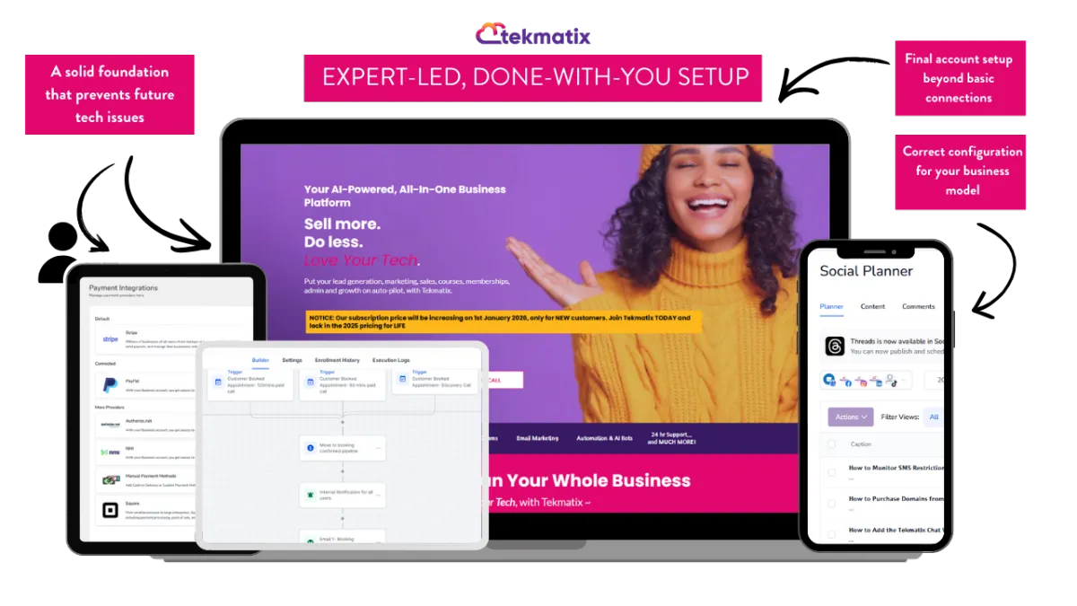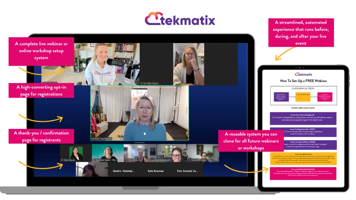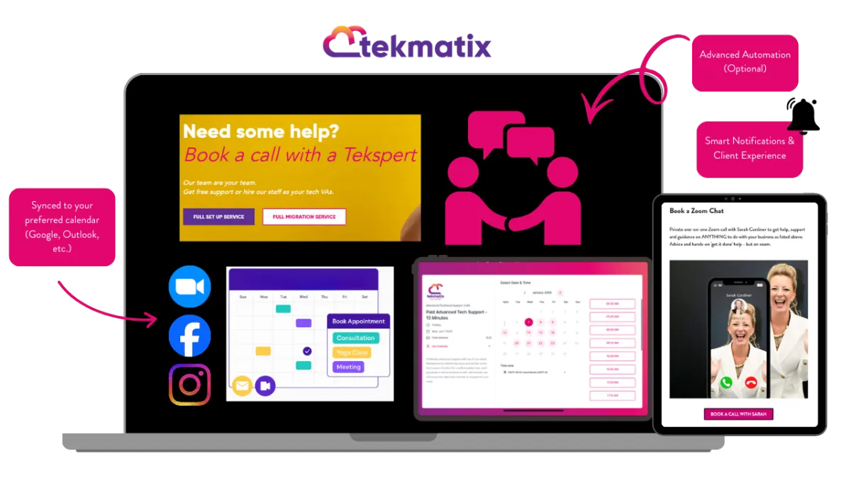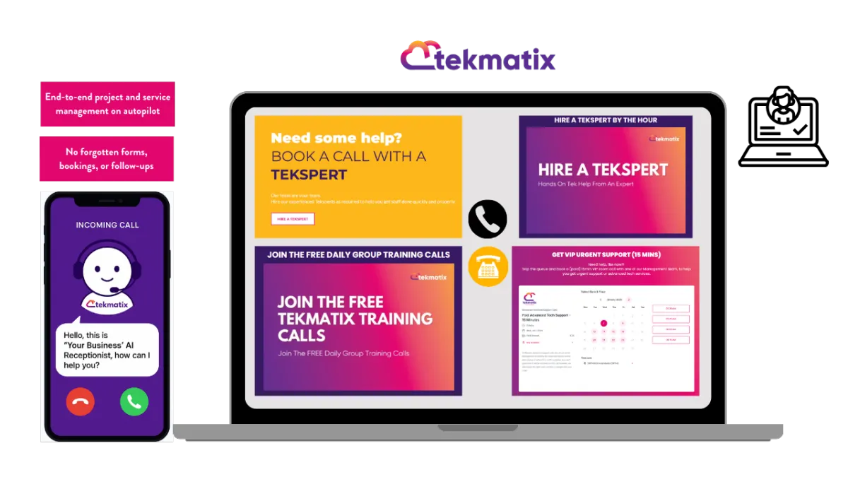 - Join a private one-on-one 90min account set up Zoom call with an experienced Tekmatix Tekspert, to walk you through AND set up your account correctly from day one. We encourage your staff or Vas join this session too. Whatever is not finished in the call, will be completed for you before or after the call has taken place.