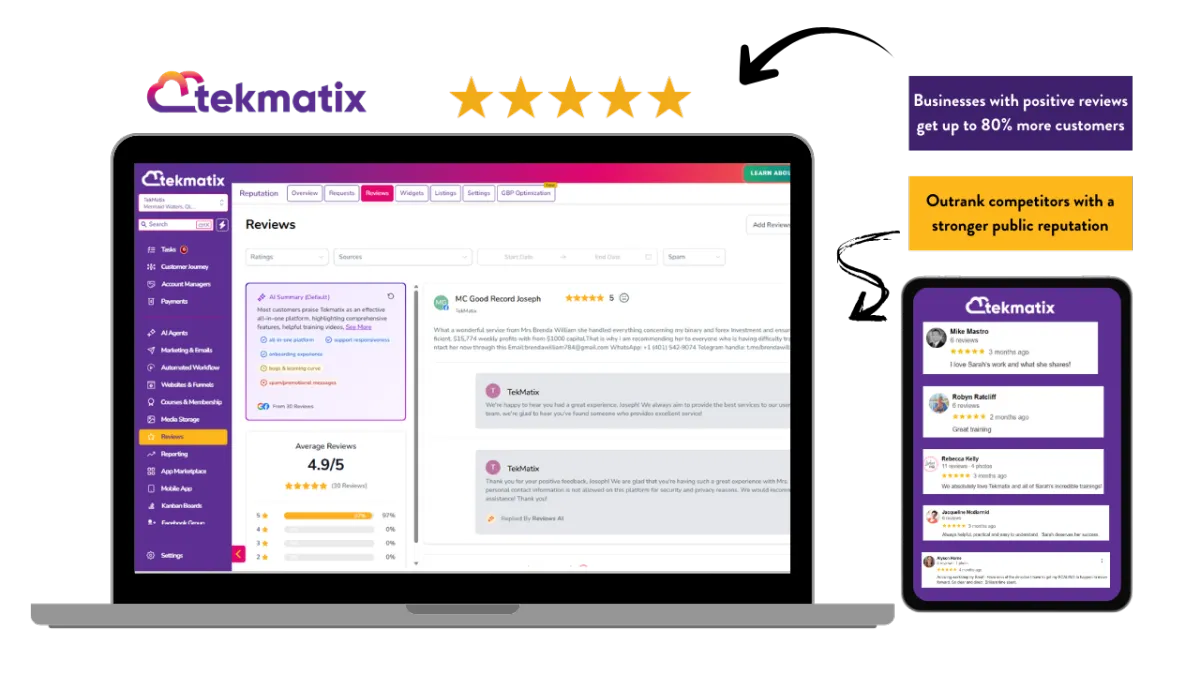 A modern day business is run by AI agents and AI employees. Why do all of the hard work when your AI and tech can do it all for you? In this service, we will set up your AI chatbots that can be deployed and active on any Tekmatix or external website and can also respond to inquiries that come from your Google Business profile, your Facebook Business profile, Instagram Business profile, WhatsApp, and much more. It will book appointments for you, sell your products and services for you, and send people to the specific product or service pages that you would like to triage and redirect them to. Getting AI bots in place will mean that you will never need to work again and could save you hours of administration every single day.