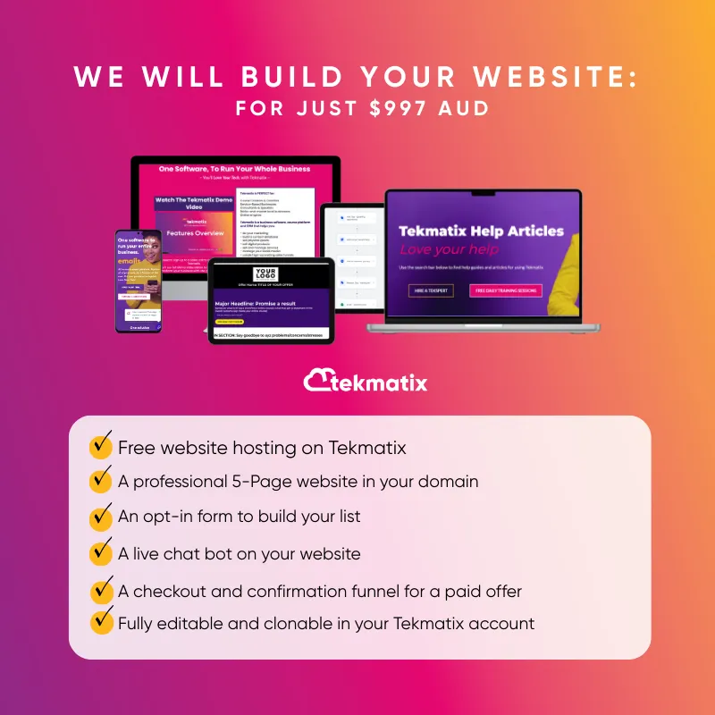 * Ongoing 1:1 support or 1:1 training is not included. You can already get unlimited free training and support via our free daily group training calls, our YouTube channel tutorial videos, our in-house training course, the ‘Knowledgebase’ on your main dashboard, our free live chat support and you can hire our Teksperts for $50 if you need one on one support.
